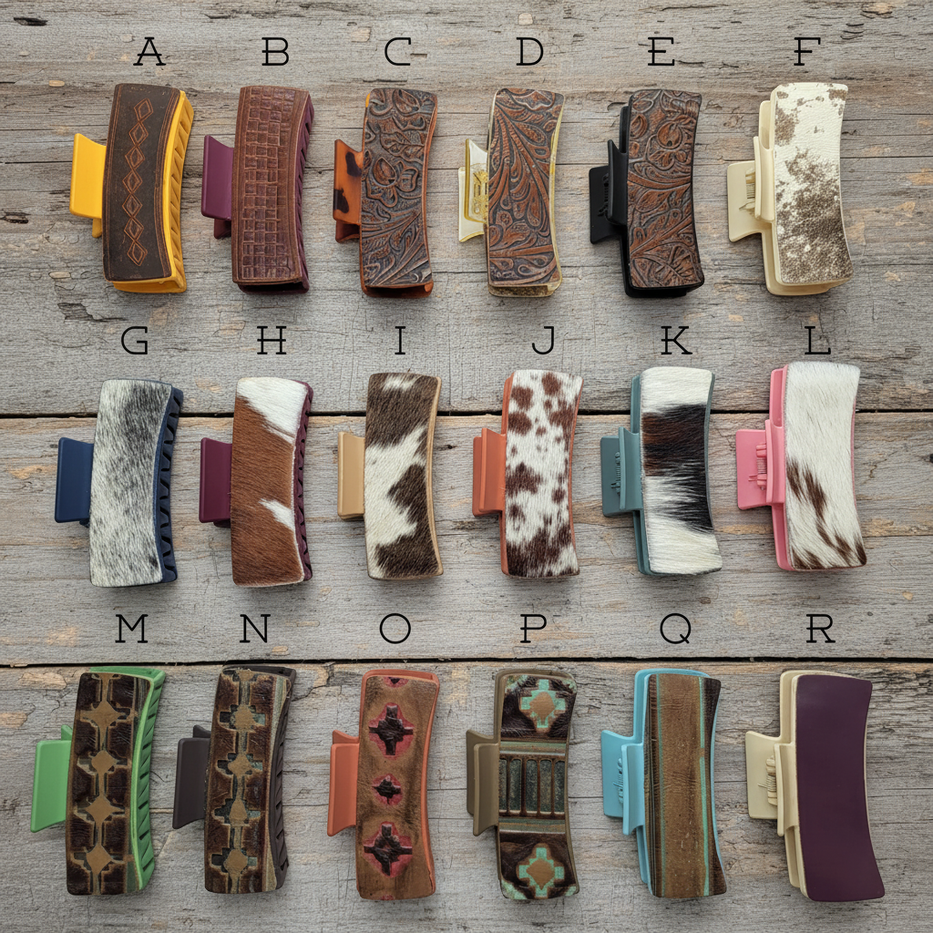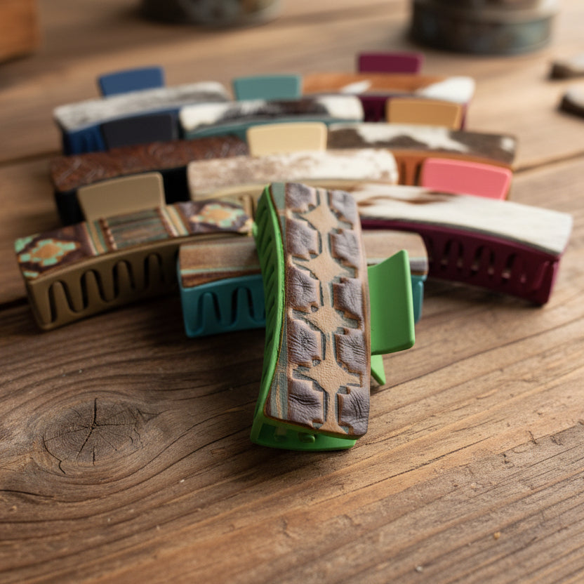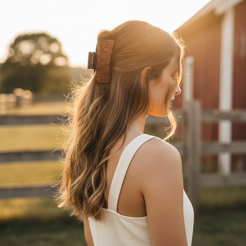 Add a touch of rustic charm to your everyday style with this handcrafted leather claw hair clip. Designed for long or thick hair, this large clip combines beauty and strength with a durable jaw-style grip. Each piece is individually crafted, making every clip one-of-a-kind. A perfect accessory for cowgirls, boho babes, or anyone who loves a touch of western flair.