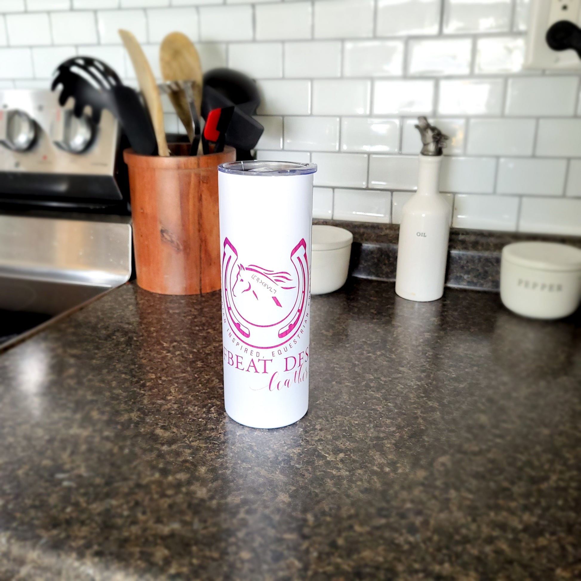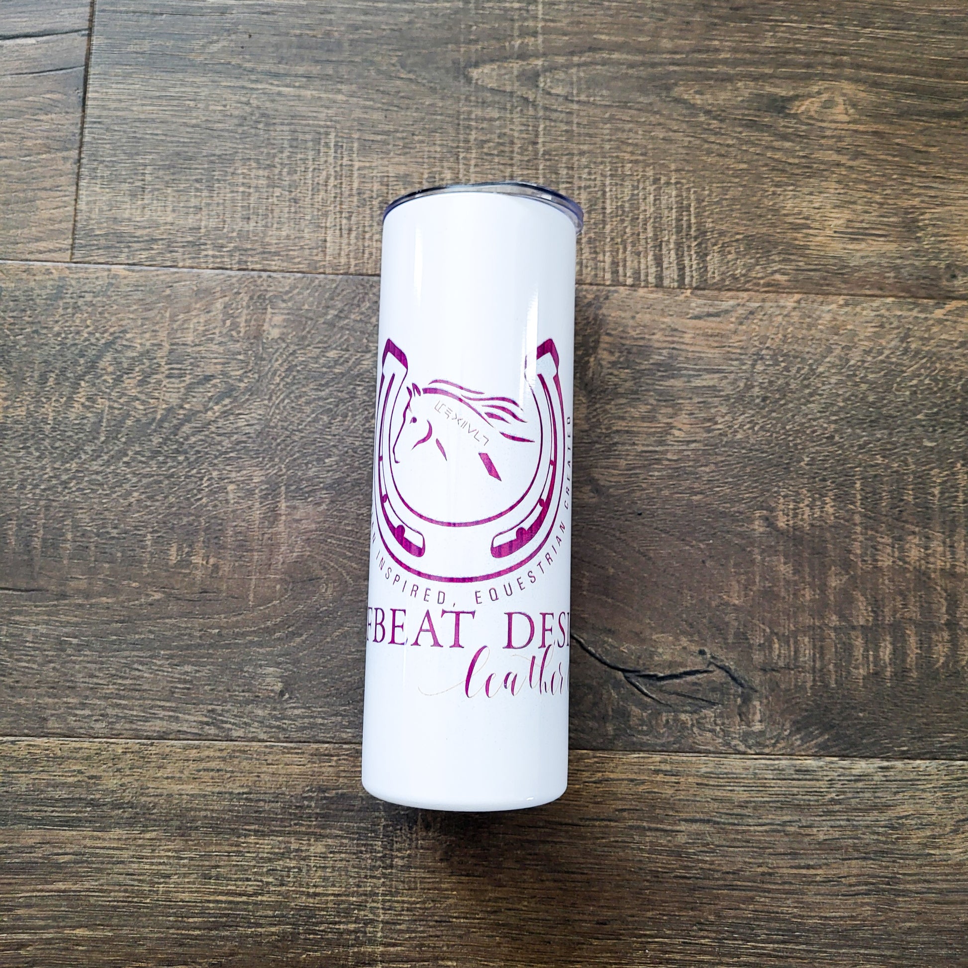 Introducing our Tumbler by Hoofbeat Designs! This sleek, white tumbler proudly showcases our vibrant purple logo. Stay hydrated on-the-go with this stylish and durable tumbler. Perfect for busy lifestyles, it's the must-have accessory for any horse lover.